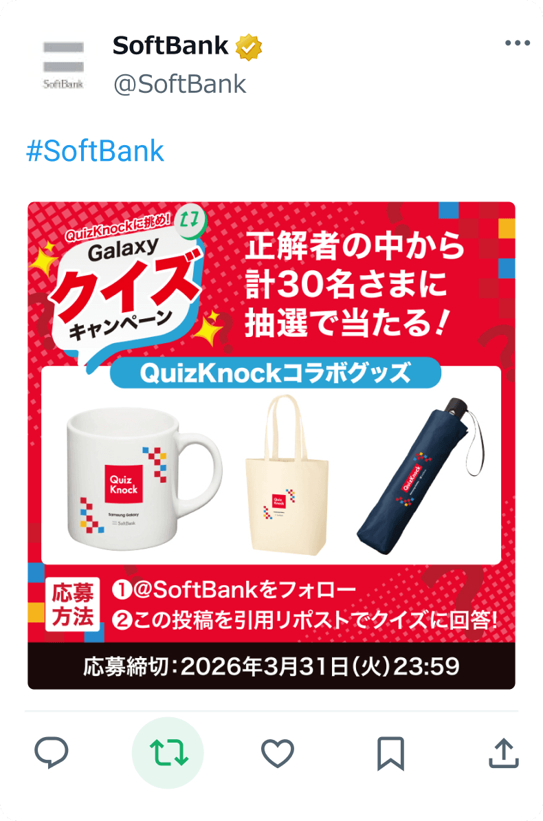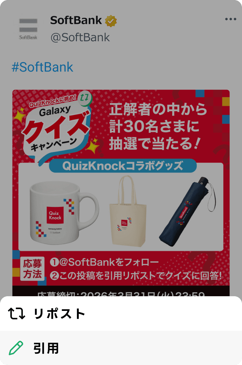 ソフトバンク公式Xアカウントをフォローして、クイズの解答を記入して対象のキャンペーンポストを引用リポストすると、応募が完了します。